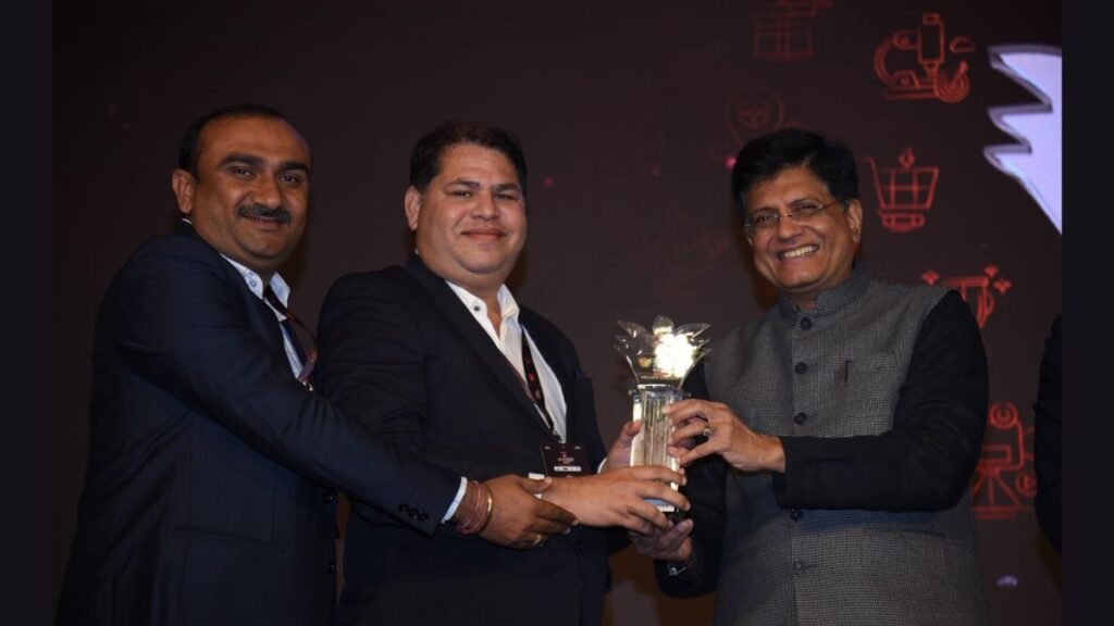 Piyush Goyal presented the leaders of tomorrow award trophy to Mr. Deepak Thacker and Mr. Rajesh Madhvi, Partners of Gujarat Logistics