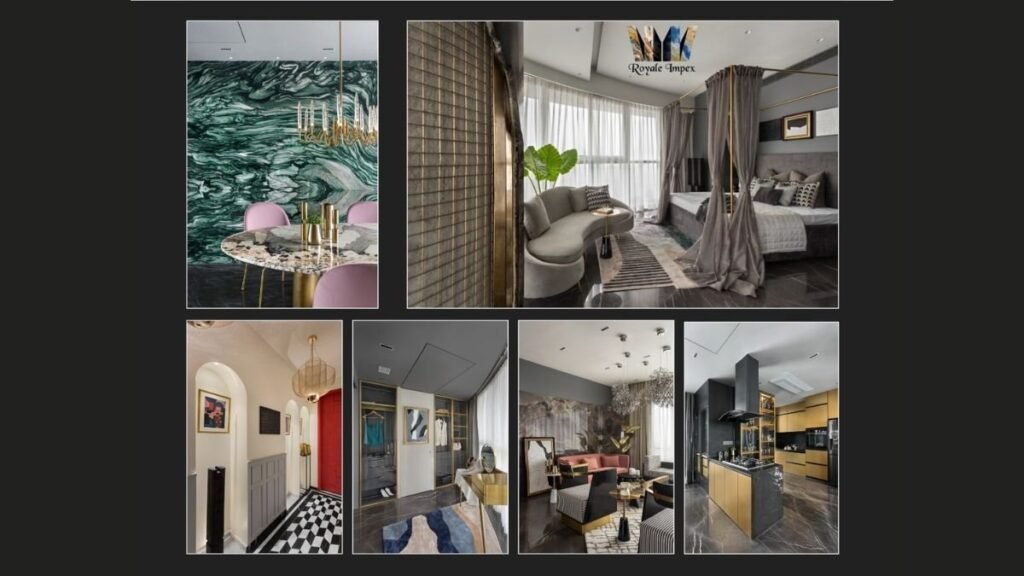 - Kitchen and Dining Area: The black and gold island kitchen aesthetic connects beautifully to the dining area, highlighted by a green exotic stone and a beautiful Patagonia countertop specifically sourced by Royale Impex for this project. A coffee counter with a marble backsplash and hidden doors offers functionality with style.