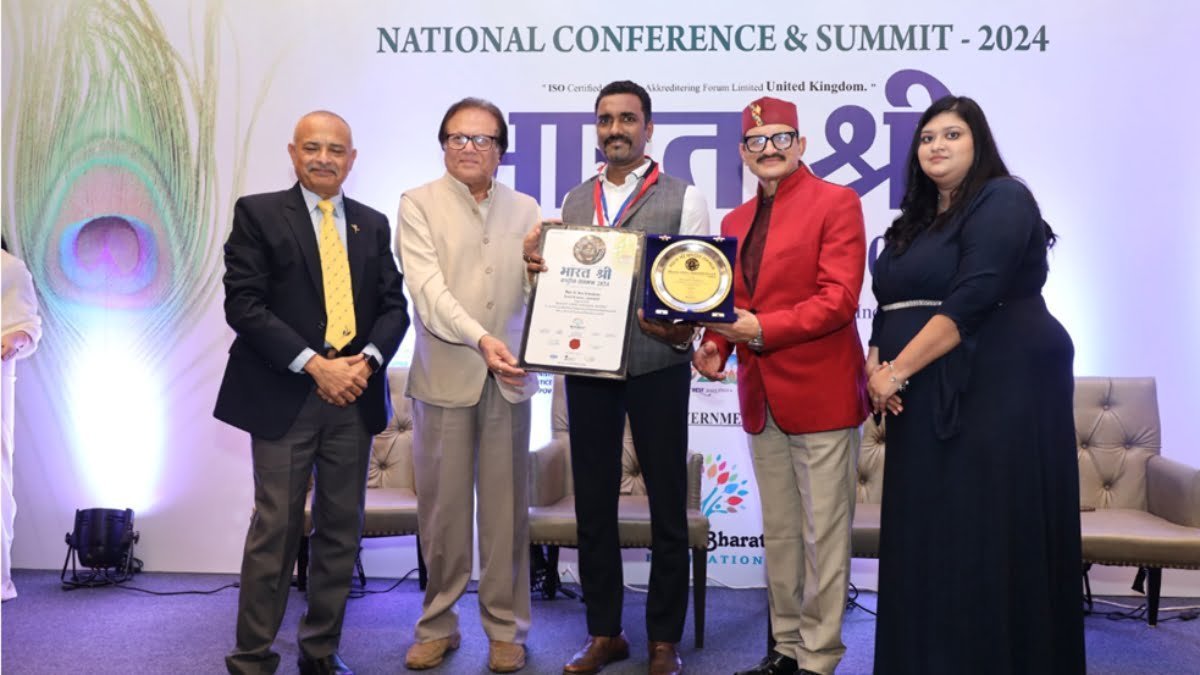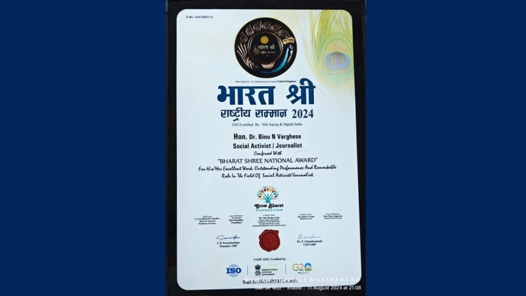 Indore, August 16: In a grand ceremony held at the Marriott Hotel, Dr. Binu Varghese was honored with the prestigious Bharat Shree National Award during the National Conference Summit 2024. The award was presented by Hon. Air Marshal Shri Shashiker Choudhary (Indian Air Force), Lt. Gen. B.S. Sisodiya (Indian Army), Bollywood actor Rajeev Verma, and Olympic medalist Mir Ranjan Negi.